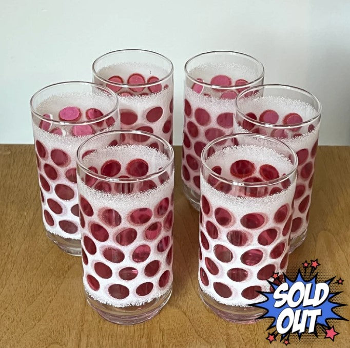 Delight your guests and relive the fun of the past with this set of six 1960s Libbey Cranberry Concord frosted coolers/highball glasses! Perfect for serving drinks, each glass stands 5.5" tall and holds 15.5 fl. oz. New without tags/box.