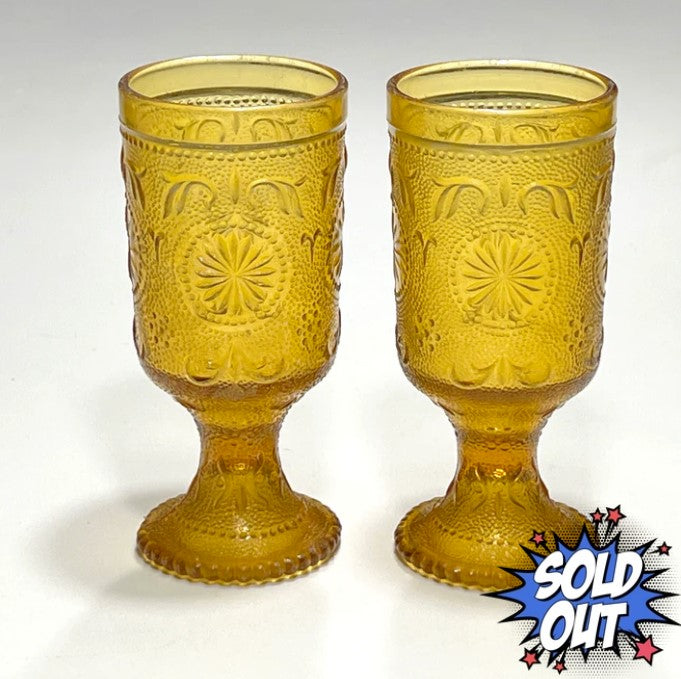 Crafted during 1977-1978 by Brockway Glass Co, these intricate American Concord Amber water goblets remain a beloved addition to any Mid-Century glassware repertoire. Featuring a textured amber pattern with scrolls and starburst details, this discontinued pattern is long-beloved. Add it to your collection or buy it for someone you love.