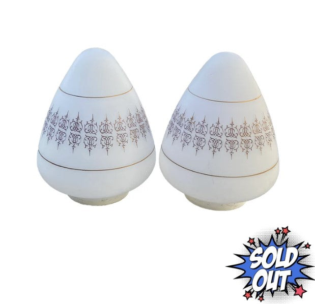 Rare Art Deco bullet-shaped, tear drop pendant light fixture replacement glass shades. These 8-in frosted shades have a gold geometric design. They would be ideal over a nightstand, used as kitchen or bath lighting. These vintage shades show normal wear consistent with age, and have no chips or cracks. Hardware and fixture not included.