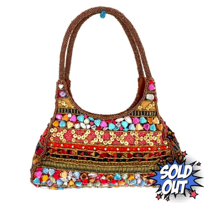 Indulge in the timeless charm of this vintage handbag from Far Nine, embellished with delicate pastel beads and shimmery gold sequins. Its versatility allows it to be dressed up or down, making it the perfect companion for any occasion. With a spacious 10"W x 5.5"H x 2-3/4"D size and a satin fabric interior with a zipper closure and pocket, this bag is both functional and stylish. It makes a wonderful gift for yourself or someone you love!