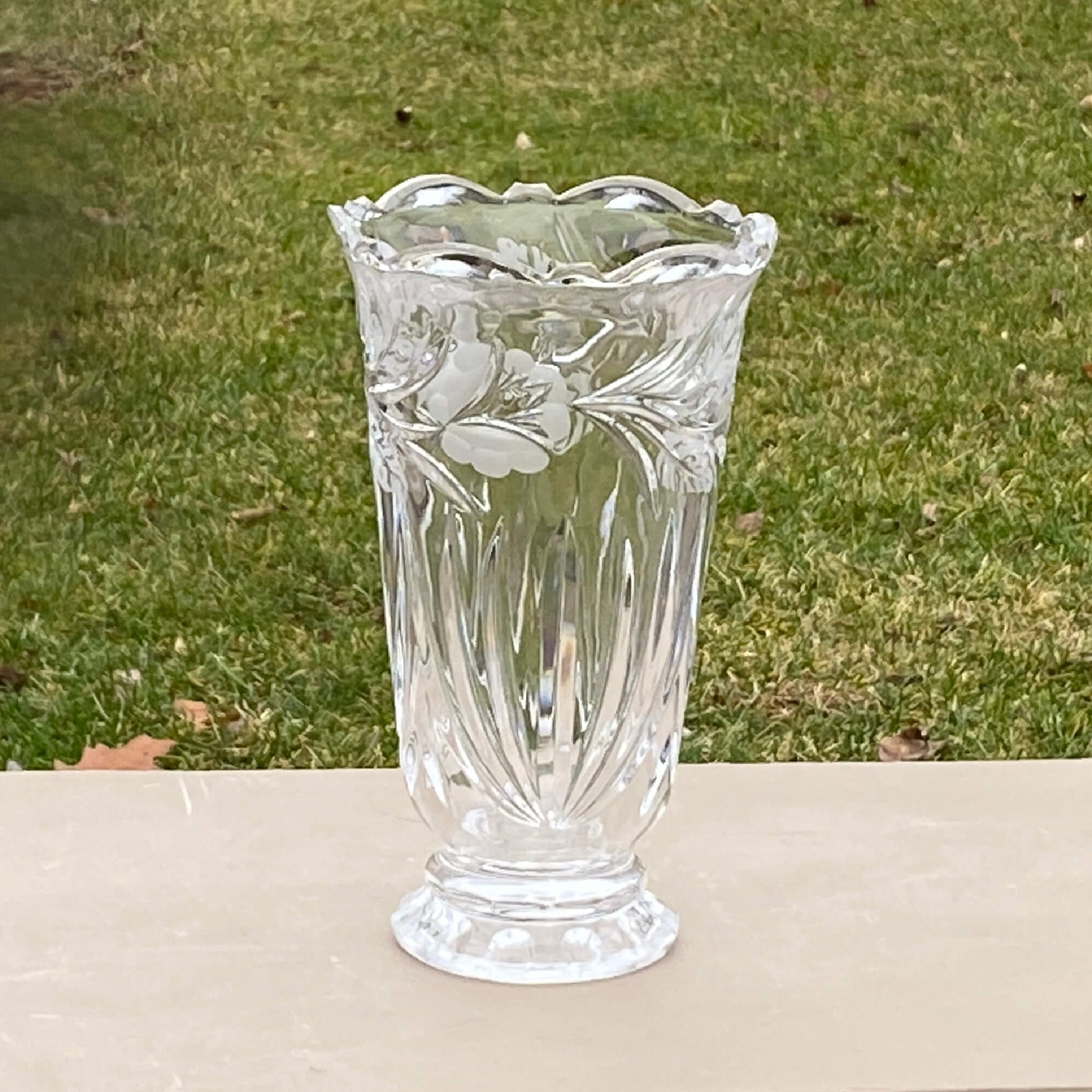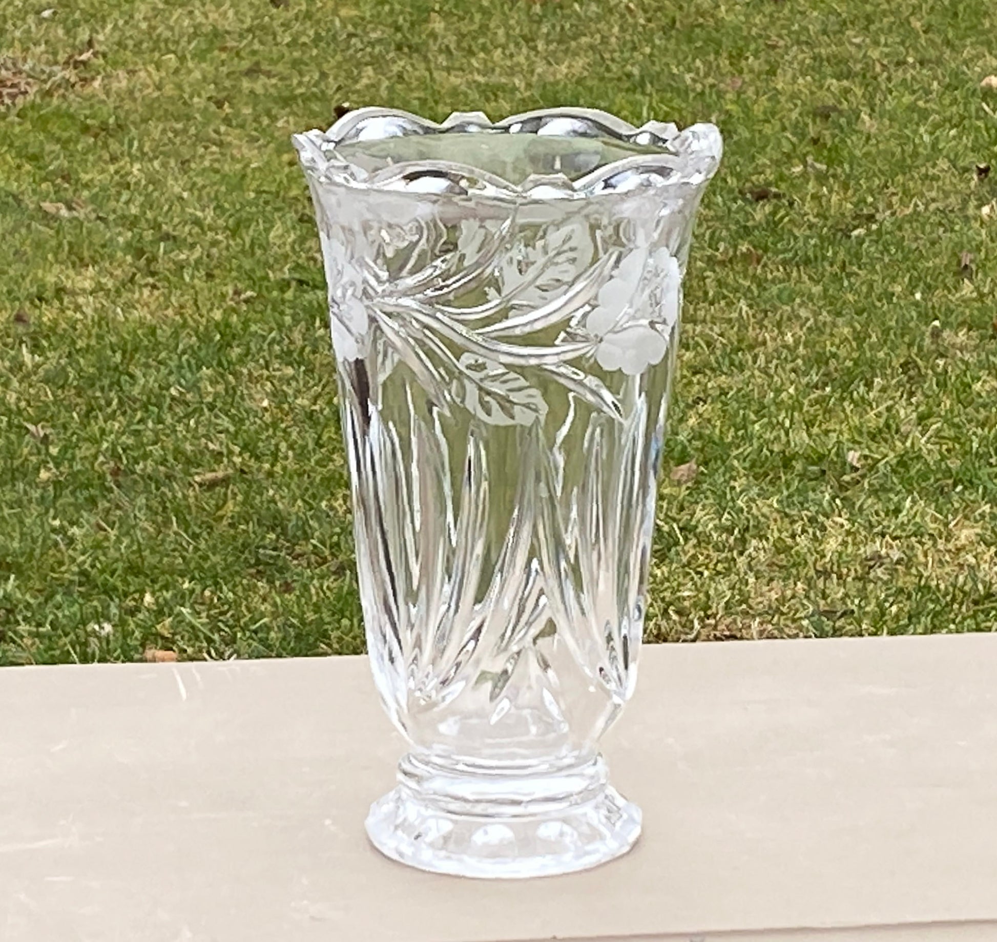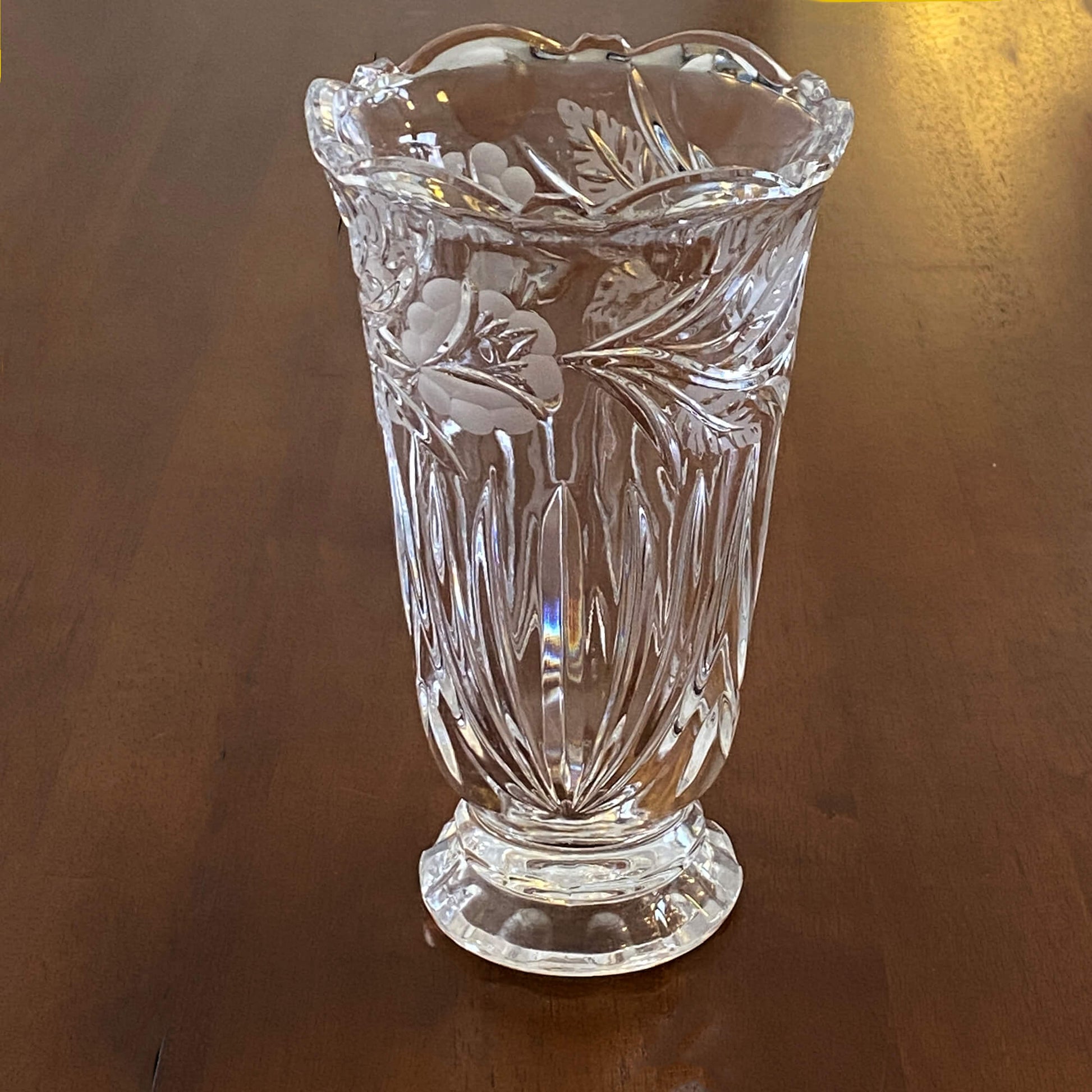 Heavyweight hand-cut flower vase from Poland. 24% lead crystal. It has a lovely scalloped edge, frosted flowers and leaves, coin dots, thumbprints near the top edge and also along the footed base. It measures 9.5"H x 5 3/8"W and it in perfect condition; no chips, cracks or discoloration. It makes a great Valentine's Day gift, wedding gift, or engagement gift. Buy it for yourself or someone you love.
