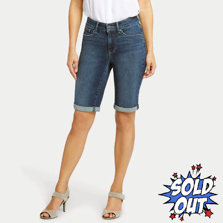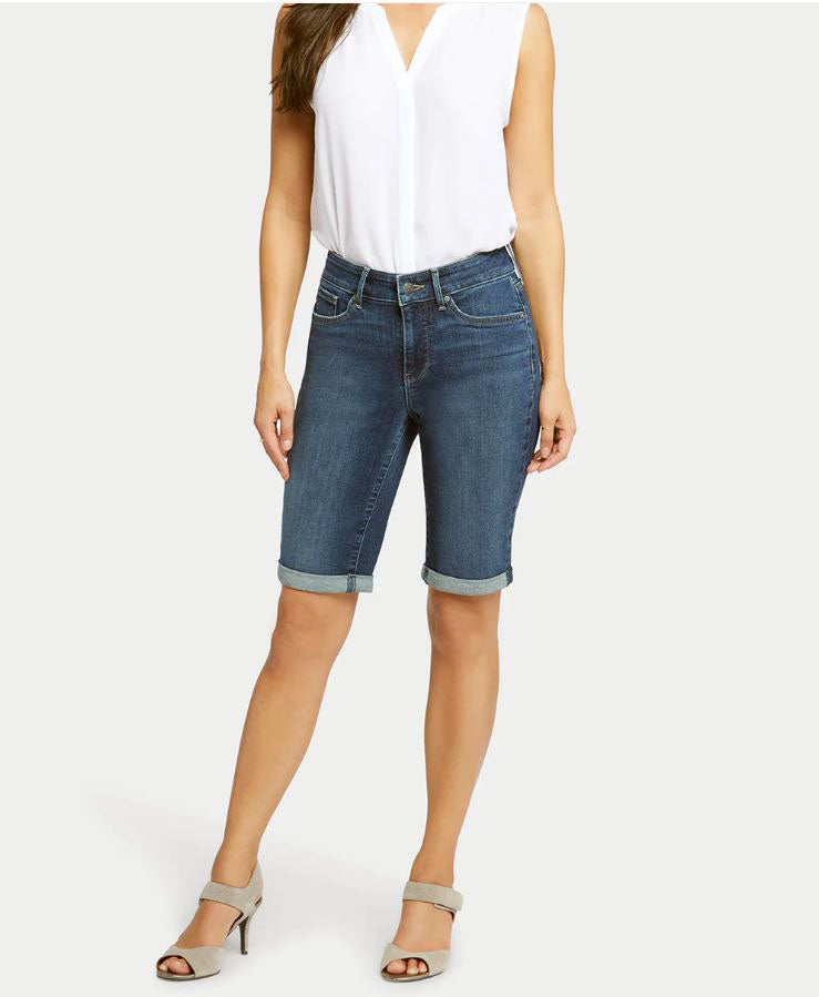 Experience the ultimate comfort and style this summer with NYDJ Blue Denim Shorts. These shorts are crafted from stretch denim and feature roll cuffs, classic five-pocket styling, and a longer inseam. With Lift Tuck Technology to slim your figure, a zip fly and button closure, you'll enjoy a flattering fit.