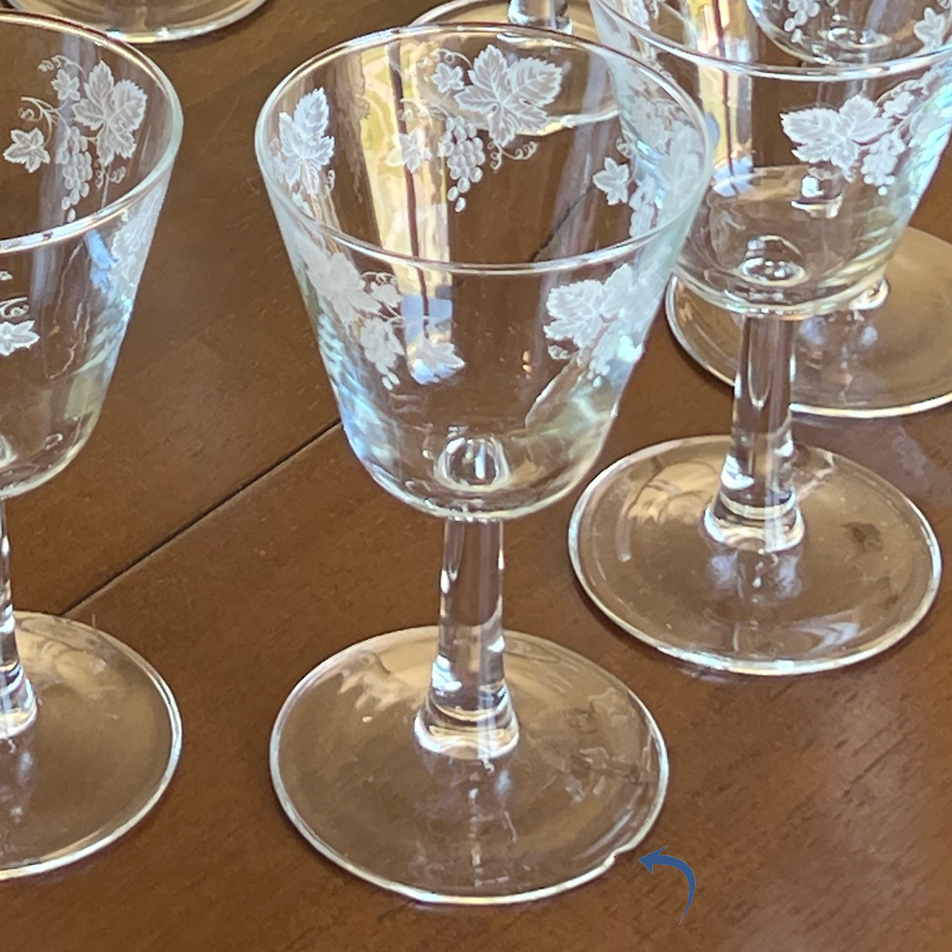 RARE JAV 6 Etched Crystal Wine Goblet Set by Javit - 5.25" - Grape, Leaf Design