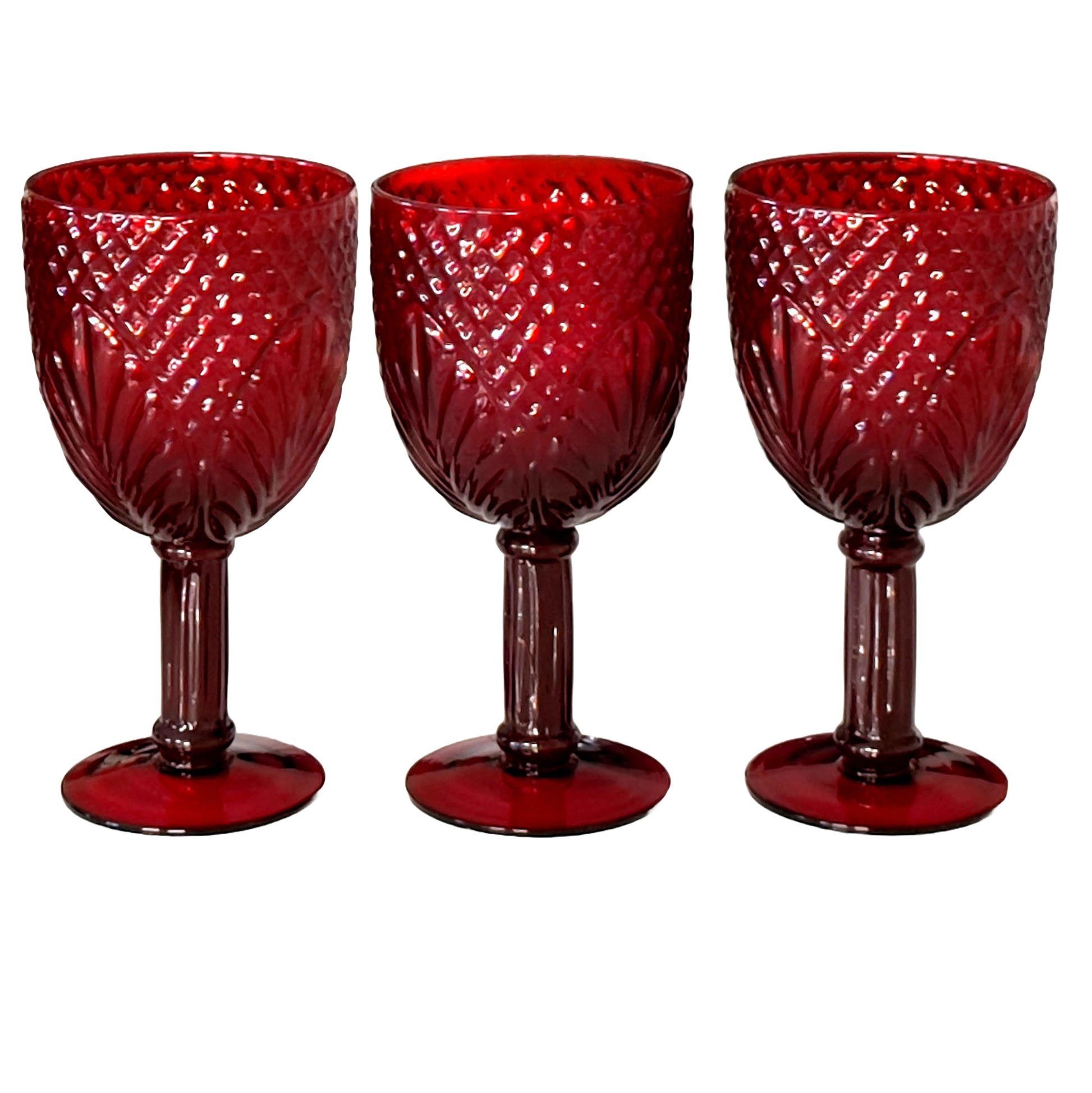 Bring a touch of elegance and luxury to your events with our exquisite ruby red glass goblets. Featuring a stunning diamond and leaf pattern and ribbed stems, these rare vintage pieces make the perfect holiday gift for yourself or a loved one. Don't wait any longer, make a statement at your next gathering with these stunning goblets!