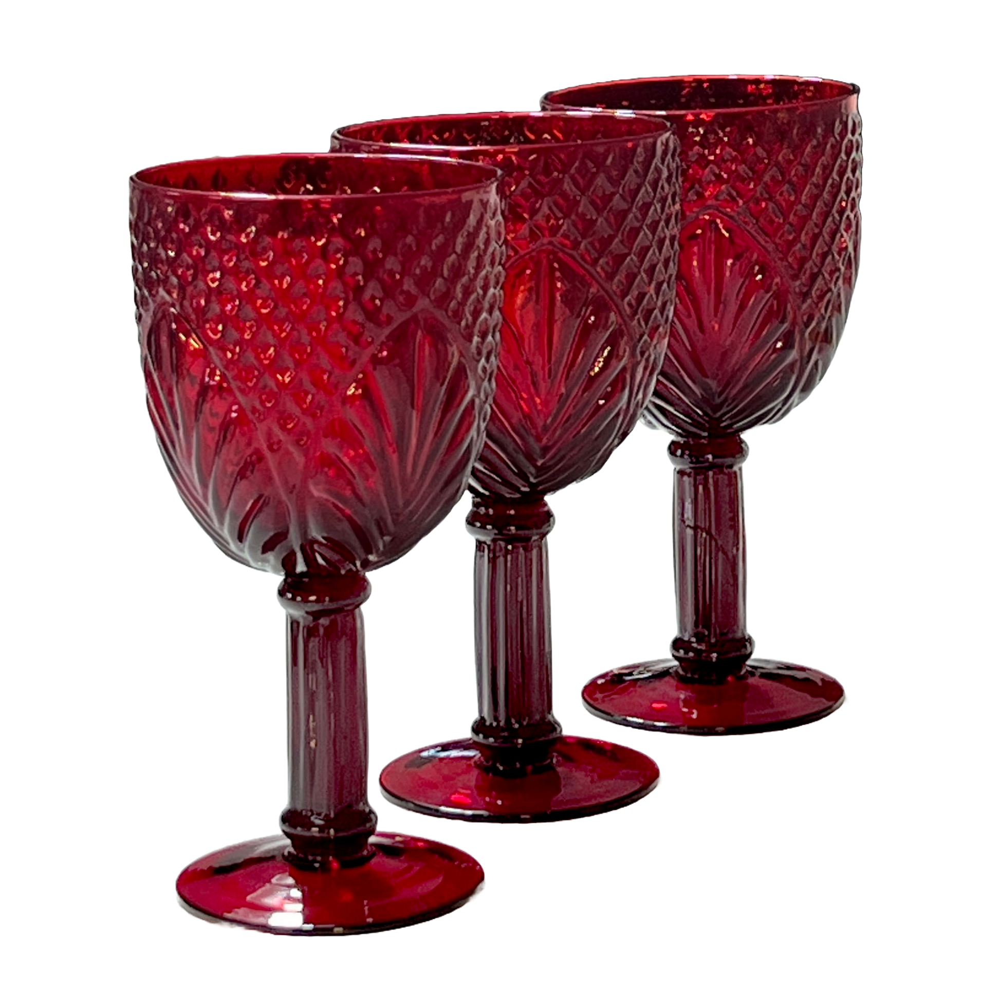 Red Glass Water Goblet Set, Diamond Fan Design 7-in.
