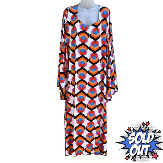 Bring back the past with this beautiful mod-colored women's plus size caftan, muumuu, loungewear dress. Size 6x/7x. Long flowing sleeves. Scoop neck. Stretchy polyester/rayon fabric.