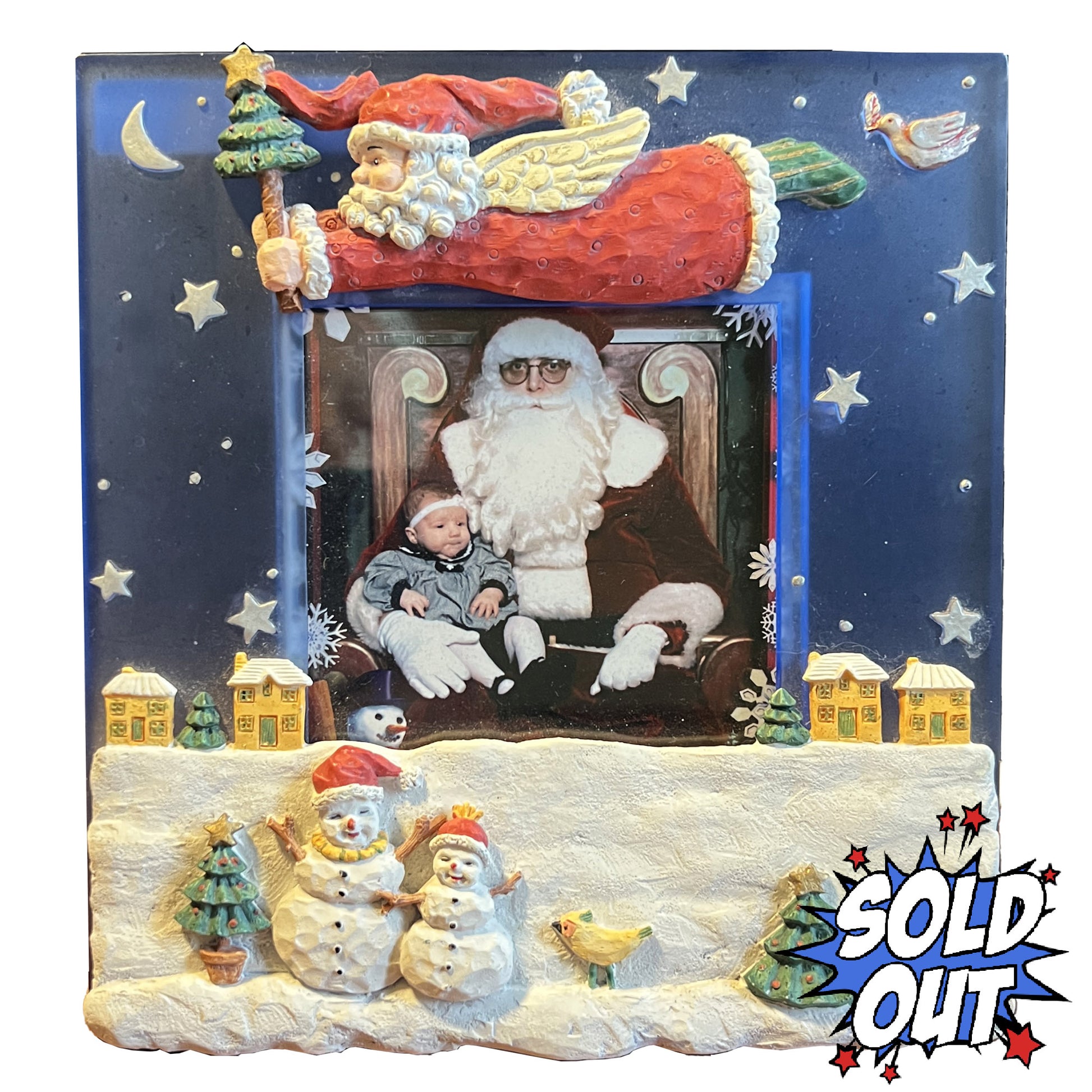 Translucent starry sky with a moon and stars and a 3-dimensional Santa Claus flying over houses and snowmen in this fun holiday picture frame. Add your child's photo sitting on Santa's lap and you'll have a memorable keepsake.