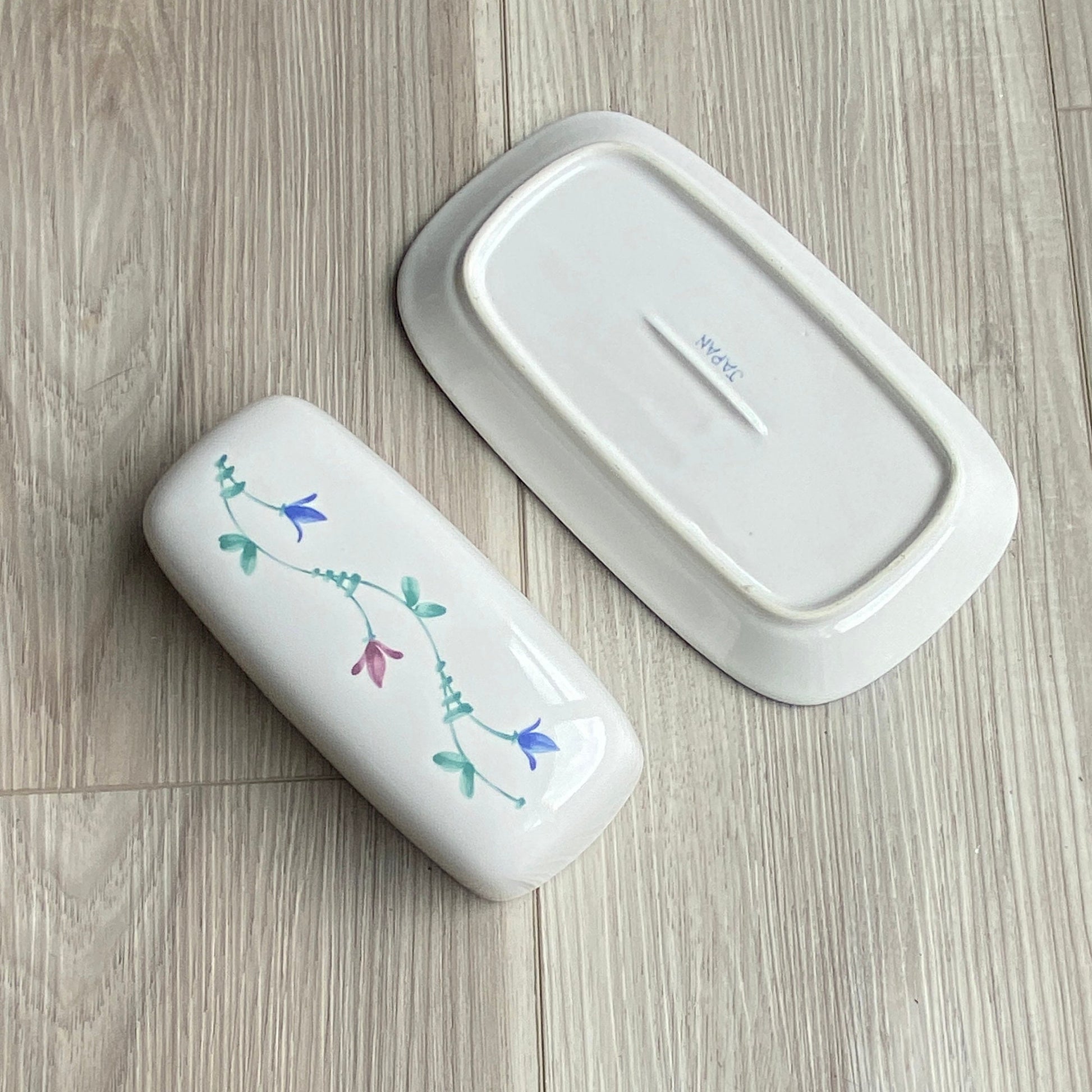 Your guests and family will adore this Savoir Vivre covered butter dish in the Portofino pattern. It is white with green, blue and pink flowers. The butter plate measures 8 1/4 in. long x 3 3/4 in wide. It has never been used and has no imperfections of any kind. Buy it for yourself or someone you love! See our other Savoir Vivre matching pieces.