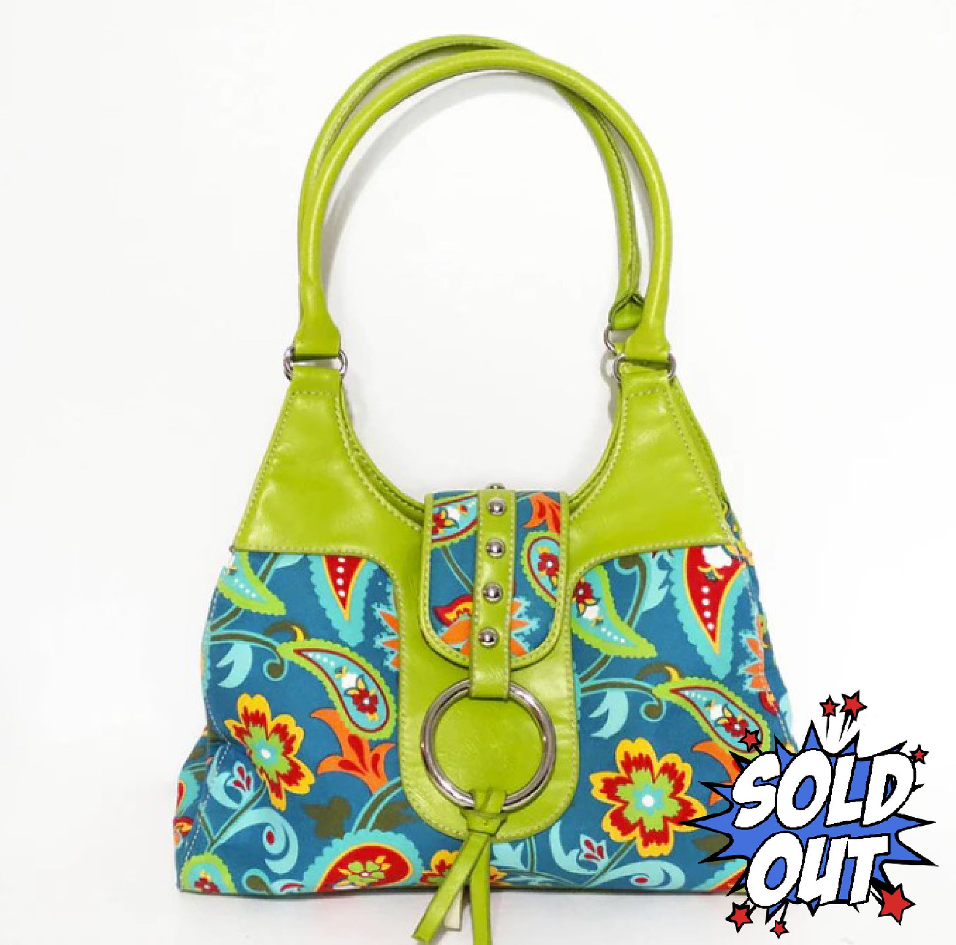 Put your groove on with this retro styled teal and green paisley floral shoulder bag from St Johns Bay. It is canvas and leather and has plenty of pockets and compartments for your cell, makeup, keys, wallet, and more.