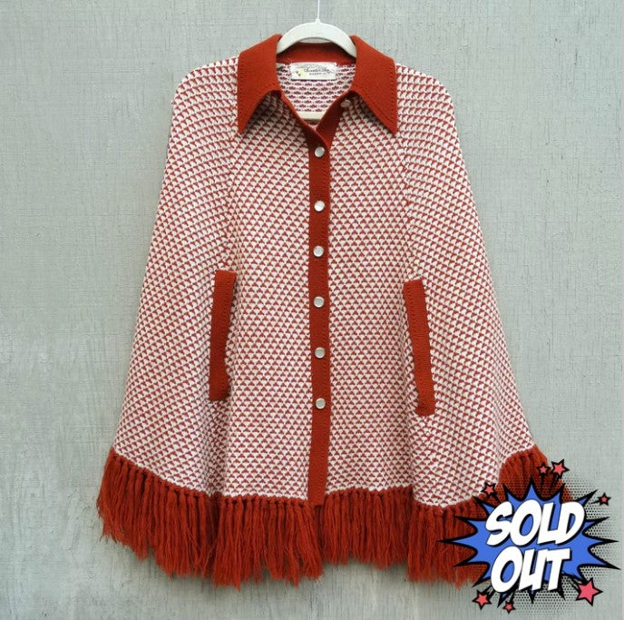 A blast from the past! This rust and white patterned knit cape is perfect paired with jeans for a casual look or over a dress worn to work.
