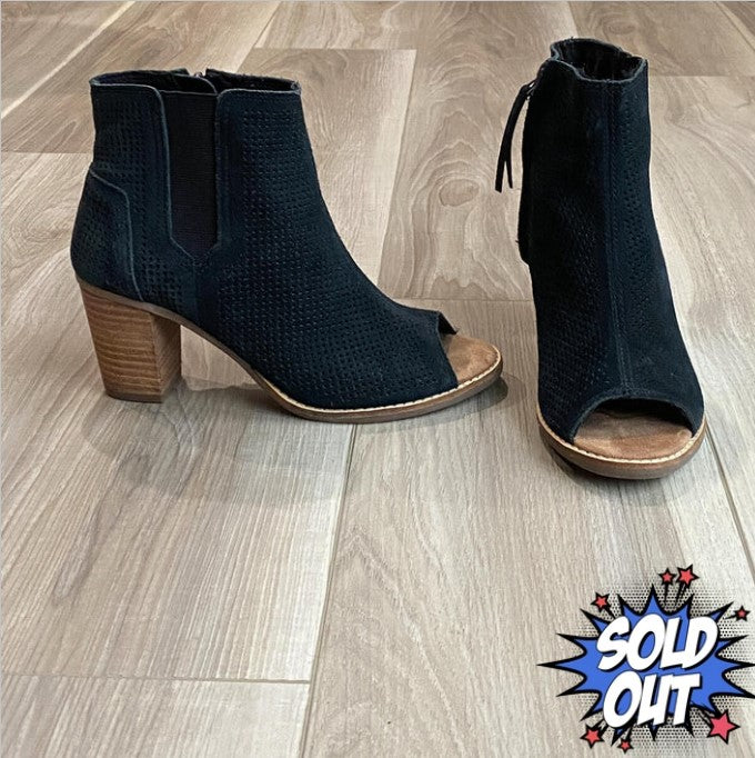 Majorca peep toe booties by TOMS. Color: black and tan. This pair of booties are versatile, casual for a night on the town or stylish and sophisticated to wear to work. Size 6.5. Condition: previously loved. They show light wear. See photos for details. This item is cross posted.