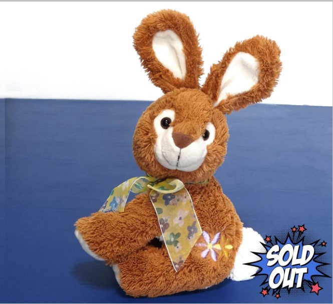 This is a very cute and extremely soft plush stuffed bunny rabbit. She is adorned with brown eyes, a color floral scarf and embroidered flowers on her hip. This bunny rabbit was made in Hungary.