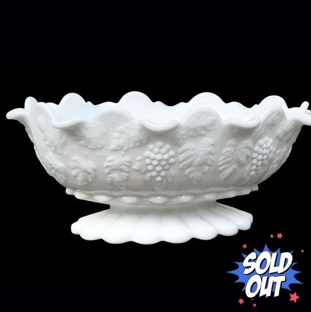 This beautiful Westmoreland oval milk glass pedestal bowl is a timeless classic! Featuring a pattern of grapes and leaves with a scalloped, ruffled rim, this gorgeous bowl can be the perfect centerpiece for a dining table filled with flowers or fruit. Weighing nearly 5 lbs., this heavyweight bowl is 11.5" long, 9" wide, and 5" high. It is in pristine vintage condition without chips or cracks! Bring this special bowl home today and enjoy it for years to come.