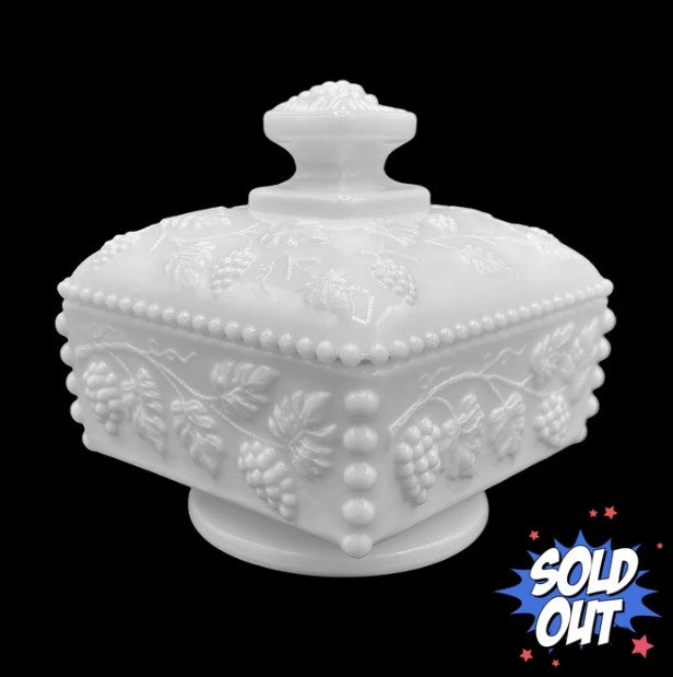 This lovely Westmoreland white milk glass covered pedestal dish features a stunning 3D grape & leaf pattern with beading around the edges - perfect for adding a touch of refined elegance! Its versatility makes it ideal filled with candy, cotton balls or jewelry. Measuring 4 1/2 inches square and 4 3/4 inch high, it's in pristine condition without any chips or cracks. Show someone special how much you care by gifting them this charming piece today!