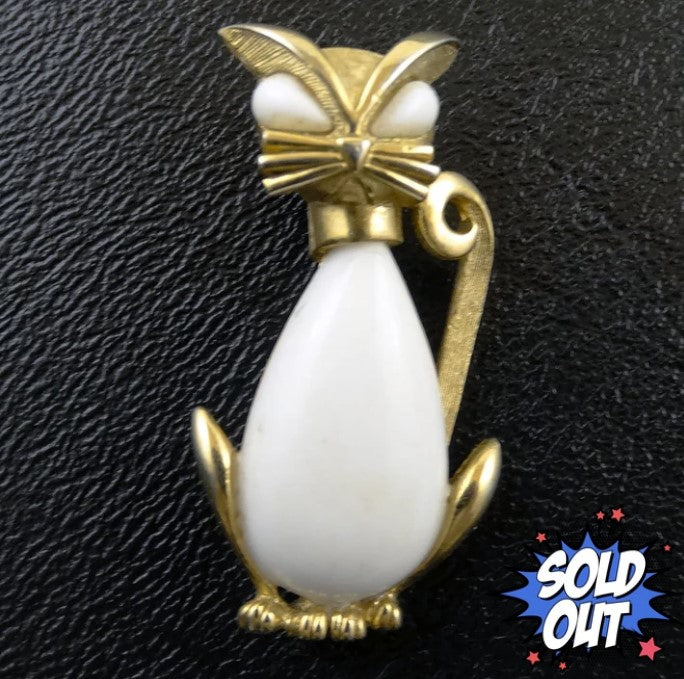 Vintage Trifari Gold and White Milk Glass Cat Kitten Brooch Pin - I've cherished this lovely pin since I was a child. As a devoted cat lover and foster mom of kittens, I'm delighted to present this vintage brooch in exceptional condition! An ideal present for yourself or a beloved one!