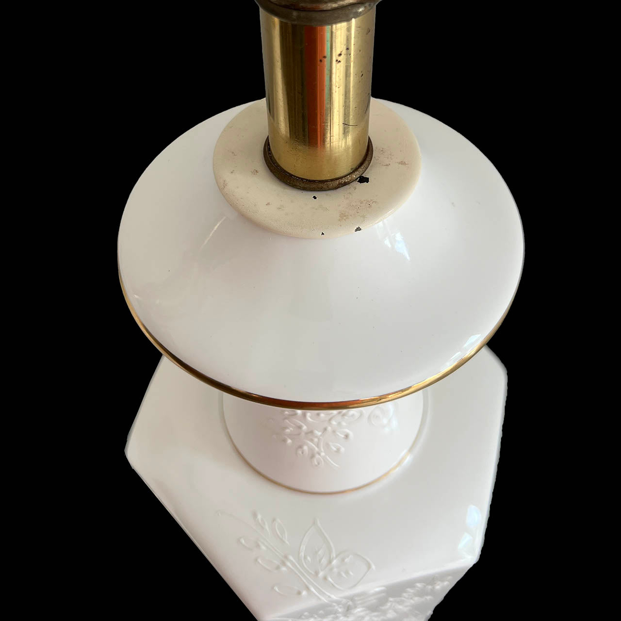 Discover the elegance of Wilmar Co. Mid-Century table lamps! In amazing condition, this pair of ivory porcelain lamps feature an ivory 3D leaf and branch design, gold trim and an antique brass base. Both harps and finials are included. All components are original and in fine working condition! The lamps are free of chips, cracks, and crazing. Some paint on the metal washers has worn away, as shown in the photos, and can easily be repaired with a dab of paint! Rare and hard to find, these stunning lamps are a must-buy—add them to your cart before someone else snaps them up!