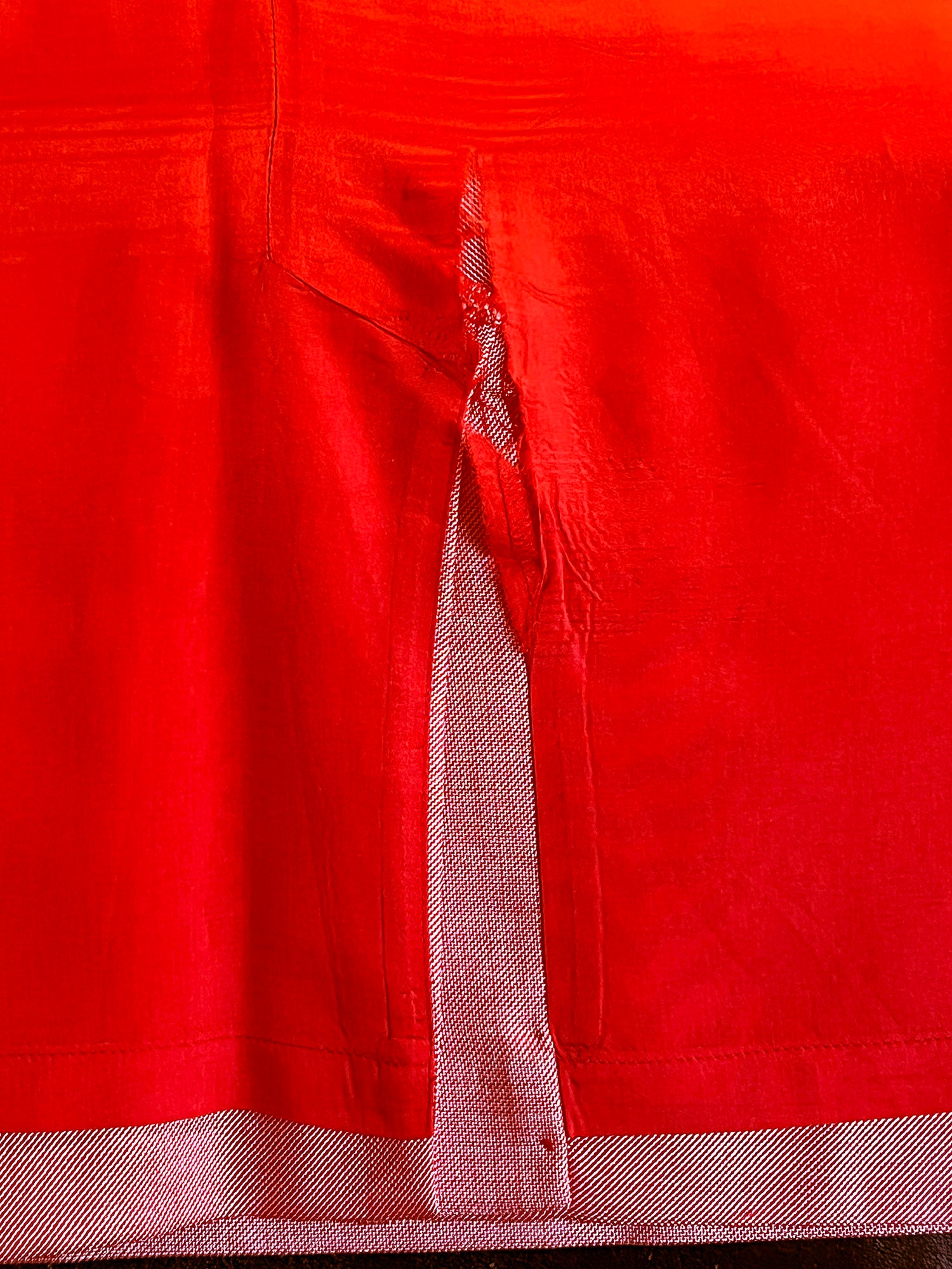 Condition: A 2-pin-head sized red dot is on the skirt. The inside lining above the back slit has a tear as shown in the photo. It is not at all visible from on the exterior. Both these minor imperfections can be remedied by a dry cleaner.